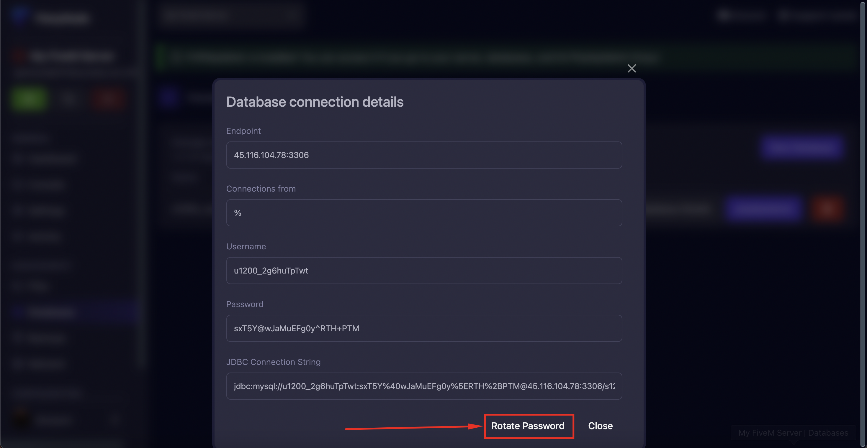 In your server.cfg file, add: set mysql_connection_string "putyourstringhere" to the beginning of the file and replace putyourstringhere with the JDBC database string that you copied earlier.