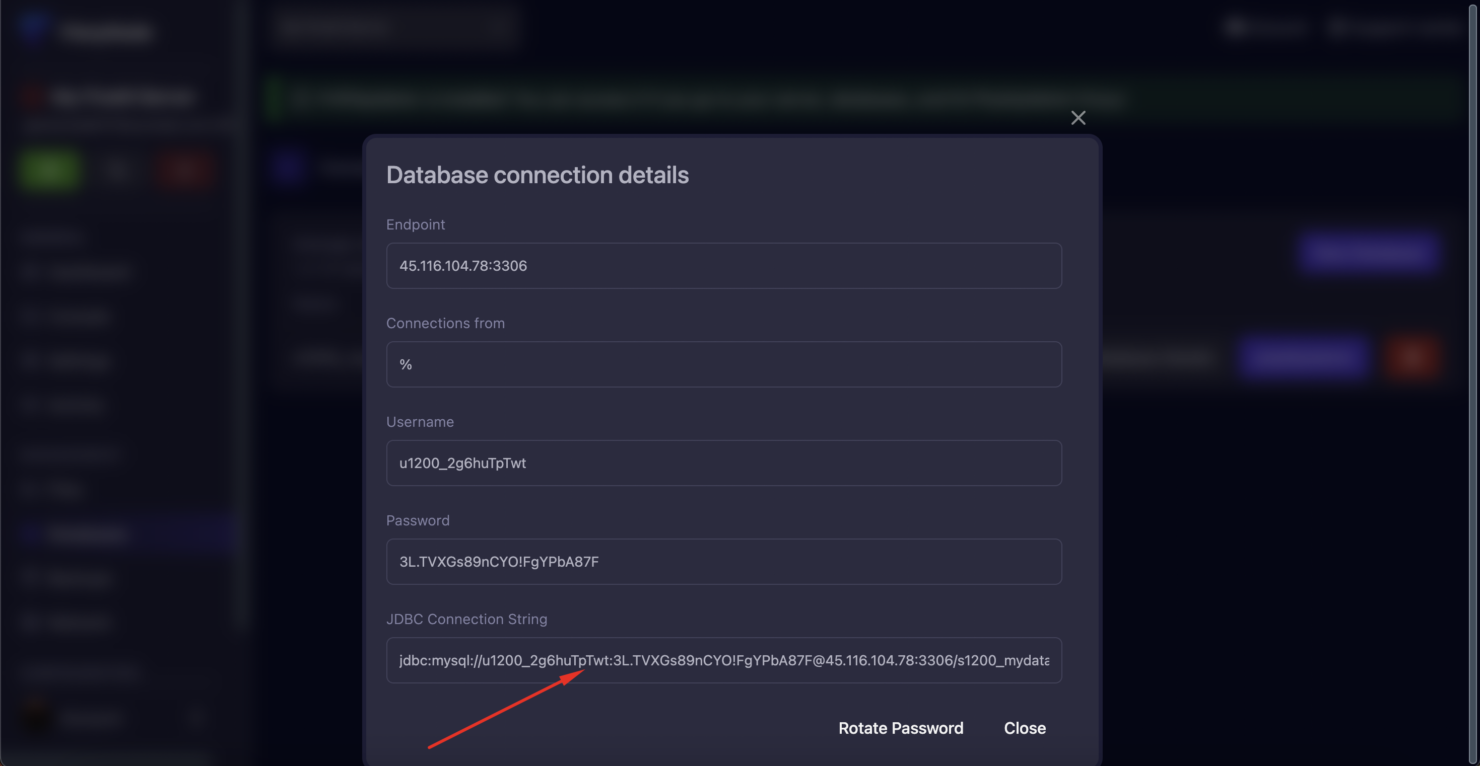 Click on the "JDBC Connection String" field to copy the JDBC database string.