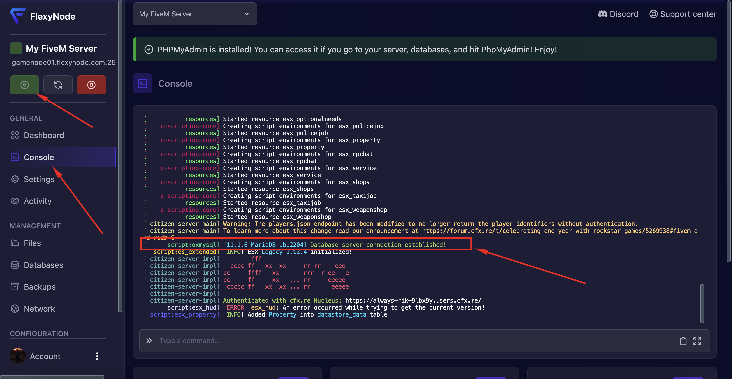 Click on the "Console" button in the sidebar and start your server. If everything went well, you will now receive a message that oxmysql has been successfully connected.