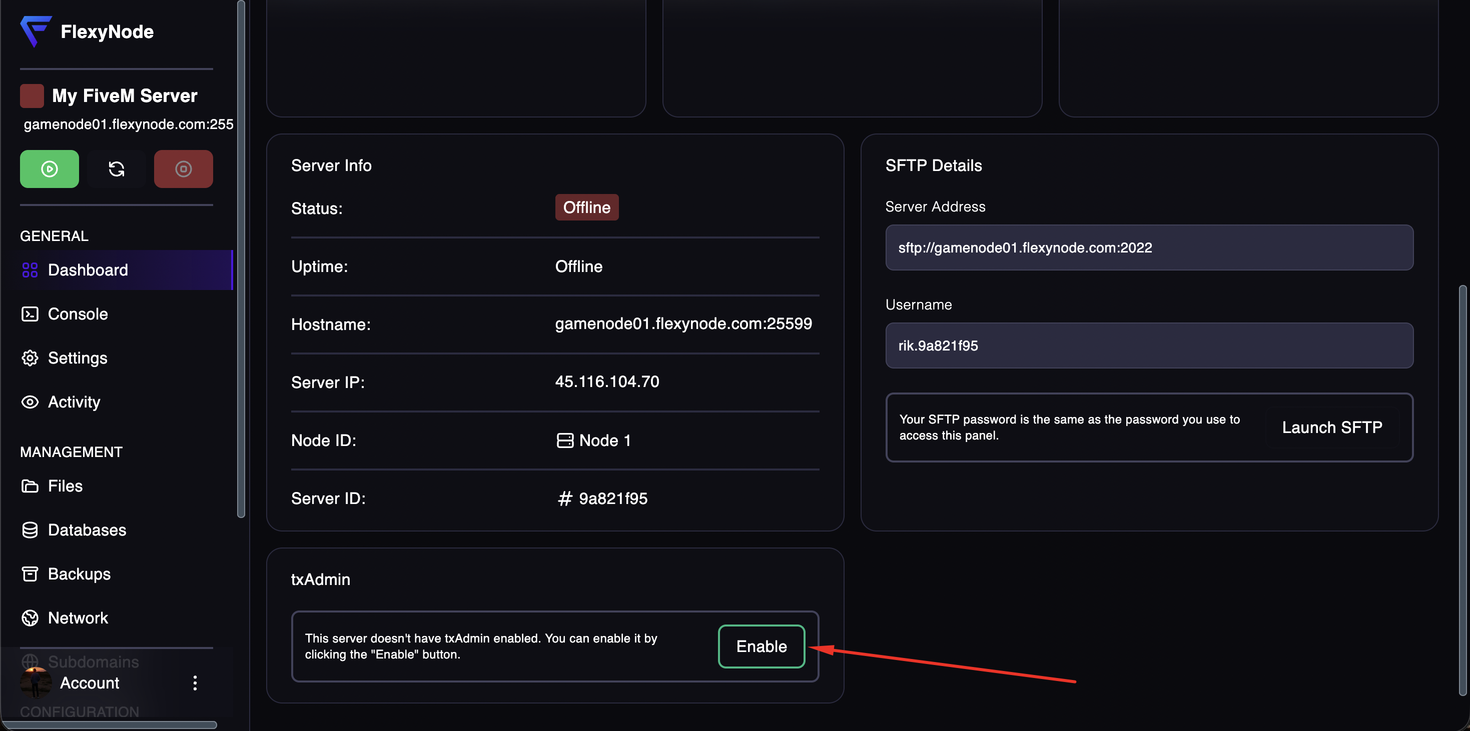 Click on the "Enable" button on the bottom of your server dashboard to enable txAdmin.